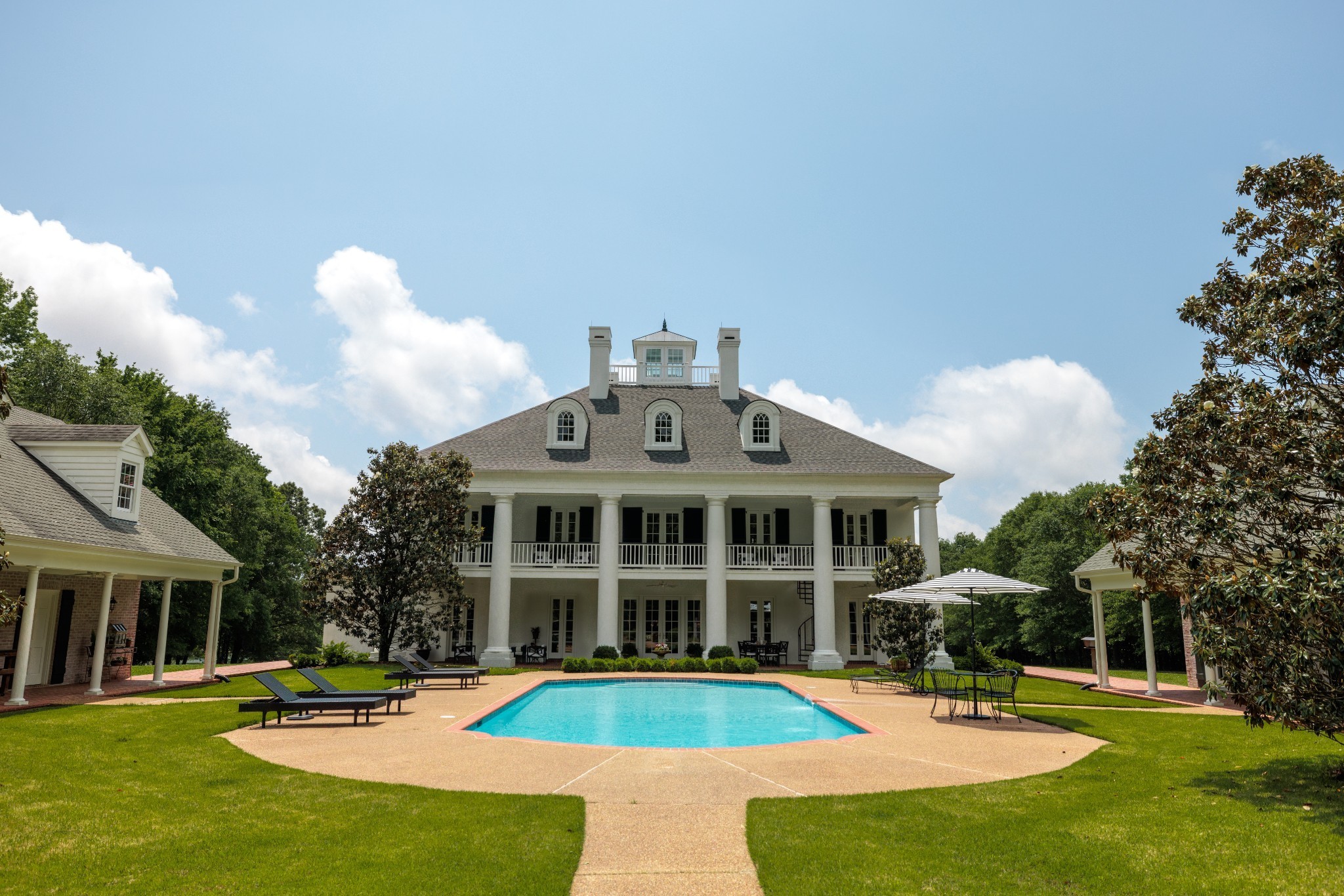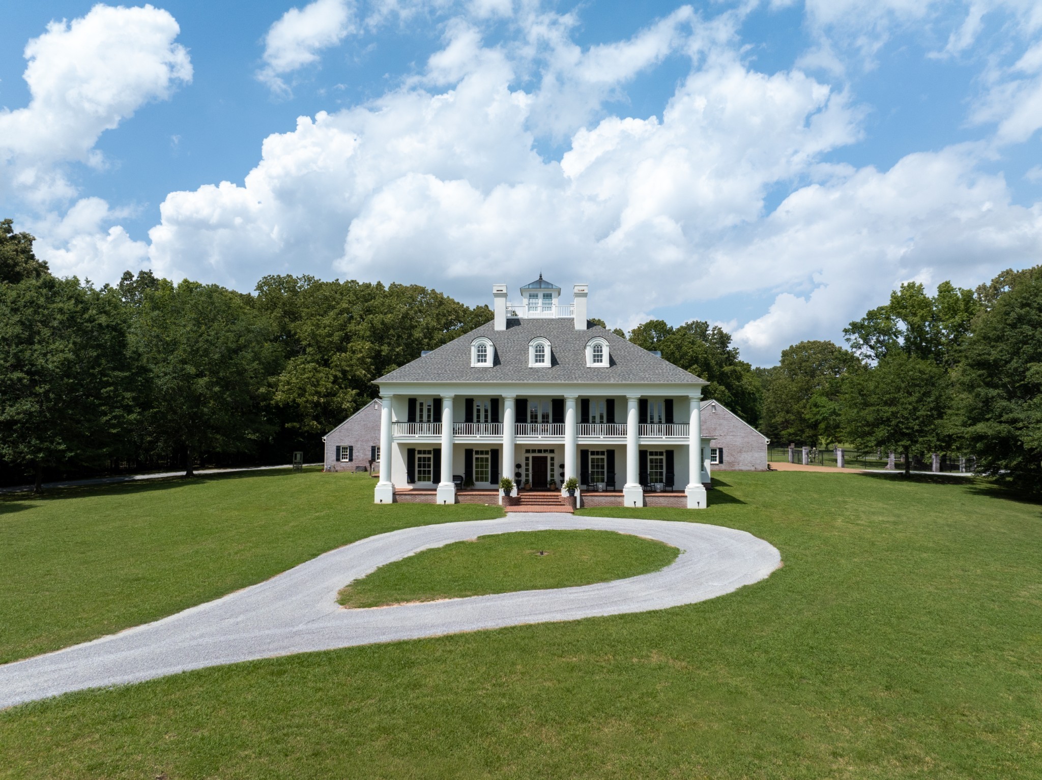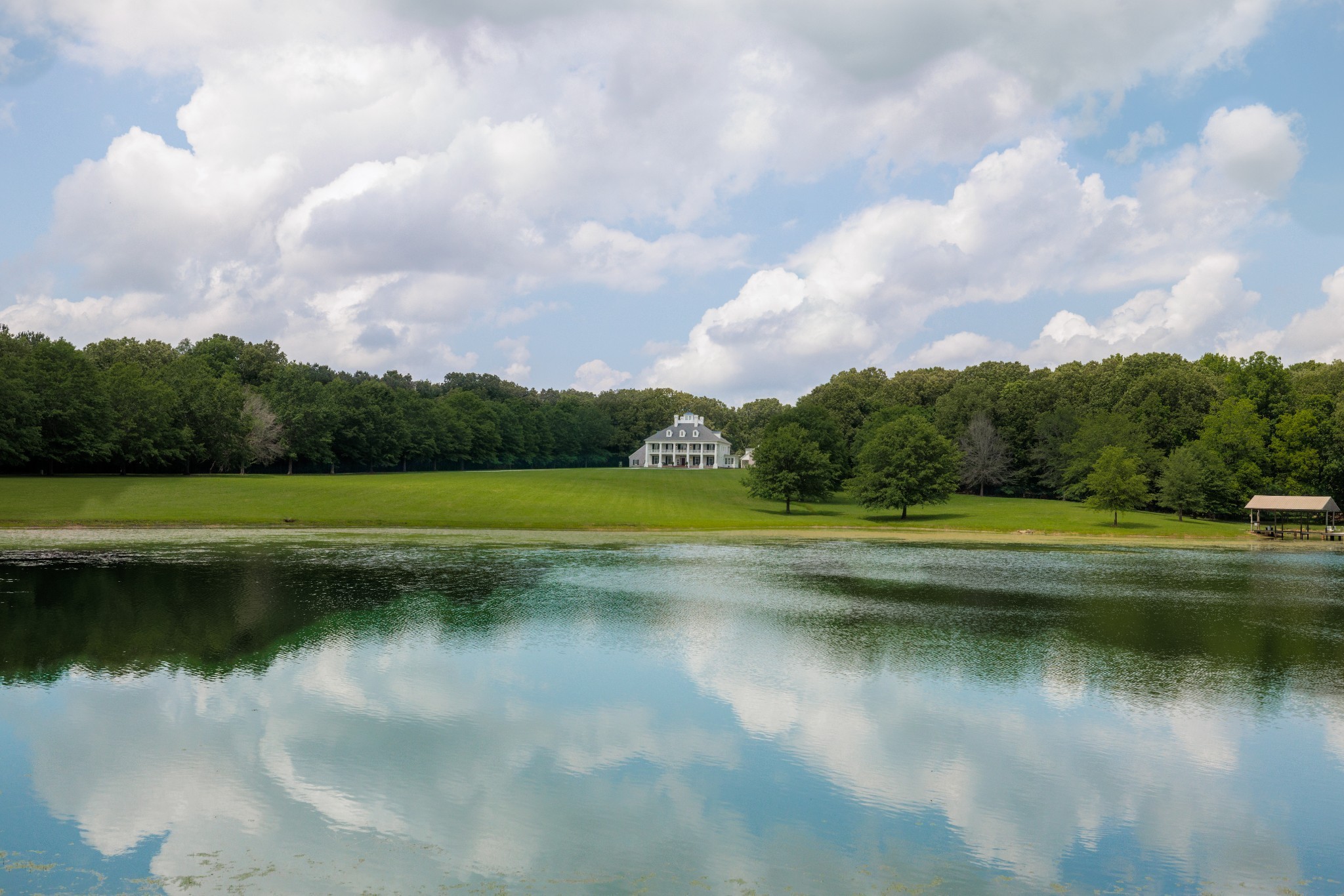 The grand entrance of this 137 acre estate begins the journey down the ¾ mile long treelined drive which meanders through multiple fields, past a covered bridge, and skirts the two acre pond and the fully stocked 8 acre lake. The trees unveil views of the stunning 8,500 sq ft antebellum home that is modeled after the Houmas House, known as the crown jewel of Louisiana’s River Road. Home boasts 6 bedrooms, 6.5 baths and four 11×65 porches framed out by grand columns providing sunrise and sunset views. Access to the pool area from bottom porch and from spiral staircase from second floor porch. The gunite pool is bookended by the 3 car detached garage and the 1600 sq ft pool house. The pool house features a full bar and living room downstairs and billiards room upstairs. Outbuildings on the grounds include a 60×100 party barn with stage for entertaining, full bath and living quarters, a 30×40 farm shop, 50×70 pole barn and 60×70 shop with full bath overlooking the lake and covered dock.
